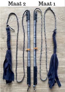 Maat 2 heeft een pvc buis van diameter 18 mm, een lengte van iets meer dan 65 cm, inclusief touw en 'prooi' 250 cm, het touw is ongeveer 10 mm